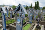 Heute sind wir ganz kreativ. Beschwingt vom Frühstück auf unserer wunderschönen Ferienhausterrasse entwerfen wir unterwegs erst mal eine Problemkerzen-App, finden einen ungarischen Geocache (Länderpunkt!) und behelfen uns mit extravaganten Kostümierungen, als pünktlich beim Eintreffen an unserer ersten Tagesstation ein Regenguss losgeht. Zwischen Wind und Wetter bestaunen wir eine orthodoxe Holzkirche (typisch für die Maramuresch im Norden Rumäniens, die wir heute durchqueren) und spazieren dann durch den „Lustigen Friedhof“ von Sapanta, dessen bildreiche und individuelle Grabsteine bestimmt noch lustiger wären, wenn wir Rumänisch könnten. Einkehren wollen wir eigentlich auch und freuen uns an der Freundlichkeit dreier Restaurantgäste, die spontan ihren großen Tisch räumen, als unsere siebenköpfige Gruppe sich suchend umsieht. Bedient werden wir dann leider nicht. Aber so „sprachwissenschaftlich“, wie wir gerade sind, bietet auch die rumänische Speisekarte viel Unterhaltungspotential: Die Wichtigkeit rumänischer Sonderzeichen leuchtet spätestens dort ein, wo das „Snitel“ dank Cedille am t als Schnitzel erkennbar wird (über die Verwechslungsmöglichkeiten wollen wir uns gar nicht weiter auslassen!)… und die zunächst rätselhaft bleibende Placinta regt uns zu innovativen Überlegungen über mögliche Zusammenhänge zwischen Palatschinken (österreichisch für Eierkuchen) und Placenta an. Autsch. Zum Glück springt irgendwann doch die Übersetzungs-App an und klärt uns auf: Es handelt sich einfach um eine Pastete.